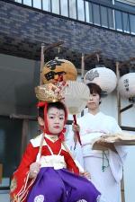 古式衣装を身に付け、花烏帽子を被った稚児は4歳から6歳の男の子。稚児打廻は、祭の無事を祈願して行われるものです。